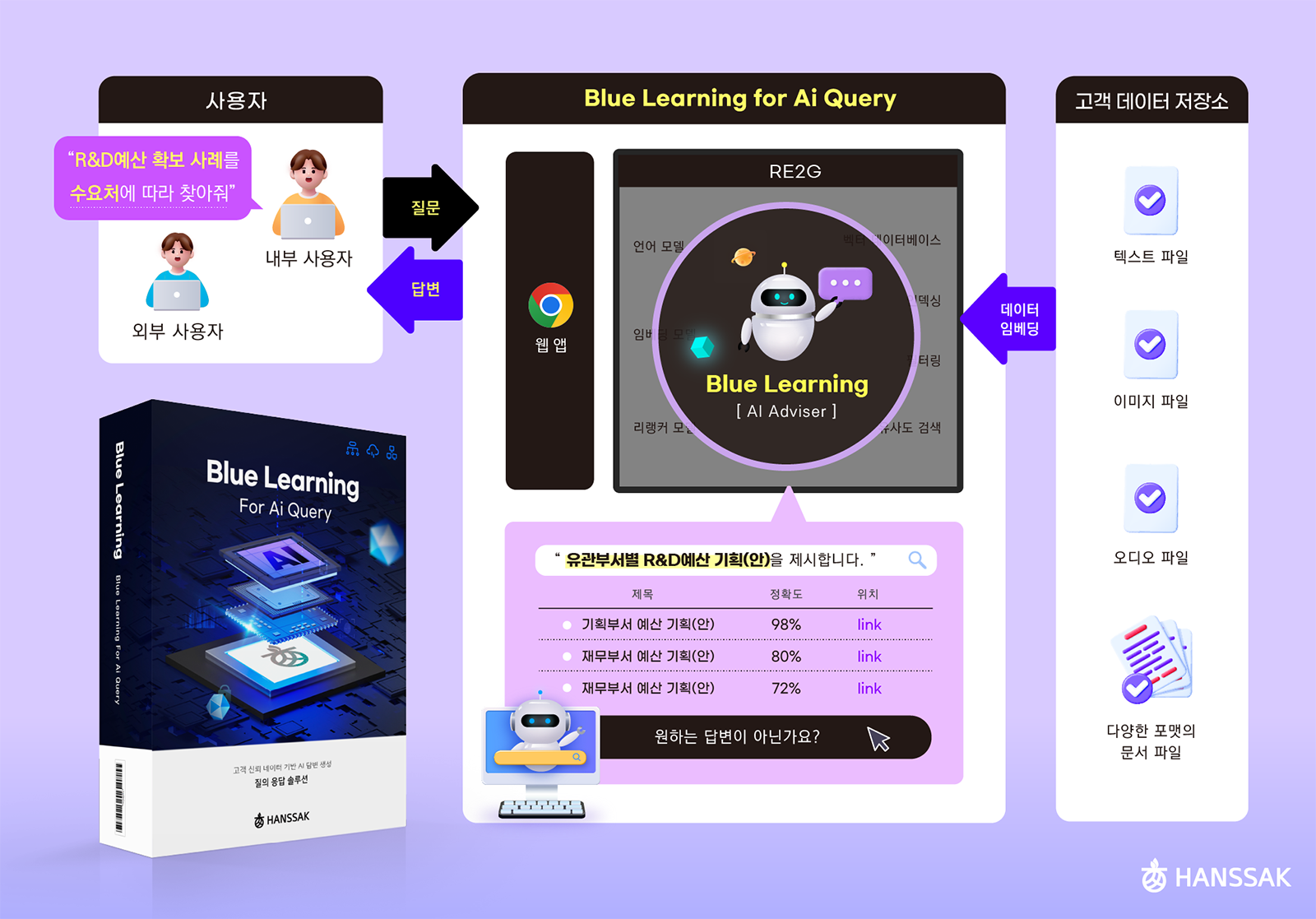 블루러닝은 고객이 보유한 문서 데이터를 활용해 사용자 질문에 최적화된 답변을 생성하는 자연어 질의응답 AI 솔루션이다. 고객의 데이터로부터 답변을 생성함으로써, 높은 정확도와 신뢰도를 보장하는 것이 강점이다.