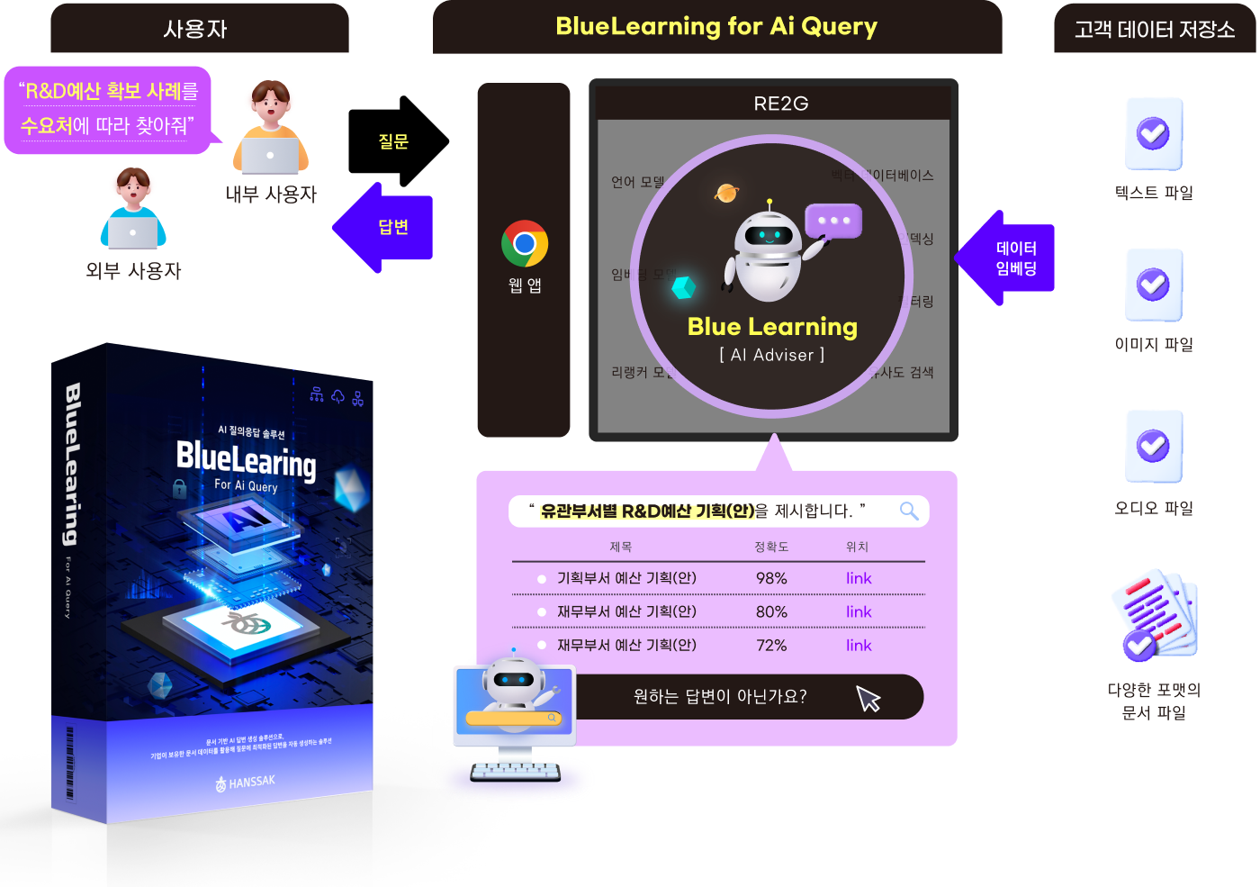 블루러닝(BlueLearning)은 고객 데이터를 활용한 자연어 질의응답 AI 솔루션으로 문서 검색과 확률적 정확도 산정을 통해